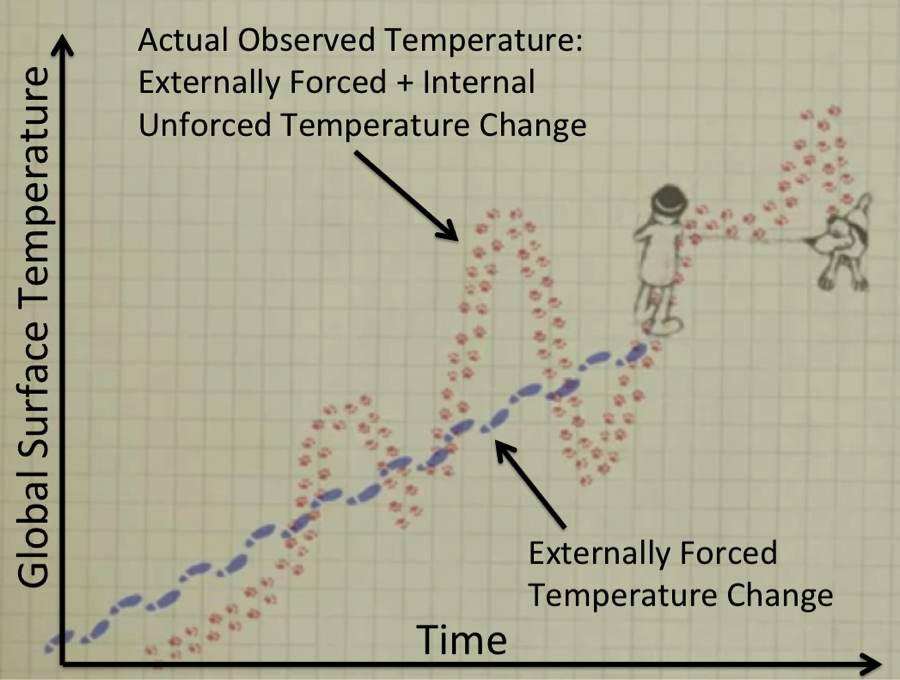 One analogy that could be used to describe the interplay between externally forced variability (like increasing greenhouse gasses) and internally generated unforced variability (like El-Niño/La-Niña) is that of a man walking a dog (Fig. 2). In this analogy the movement of the man represents the externally forced variability and the movement of the dog, relative to the man, represents unforced variability. The man moves in a rather determinist, predictable path while the dog moves in a more random unpredictable path. Many with engineering backgrounds will recognize this as a signal-to-noise issue. Notice that the dog can only wander a certain distance away from the man before the leash pulls it back toward the general direction of the man. Because of this, the path of the dog ends up being the sum of the path of the man plus the movement of the dog. Analogously, the temperature progression that we can observe is the externally forced component of temperature change plus the internal unforced component of temperature change.