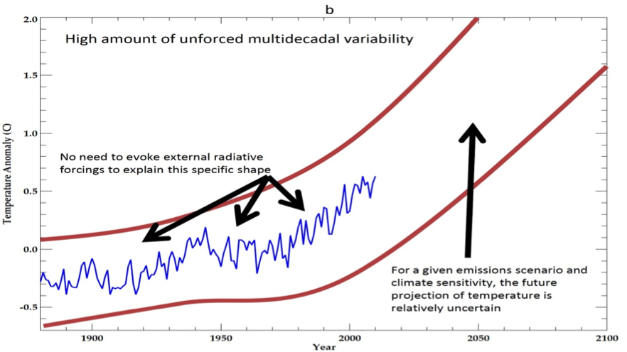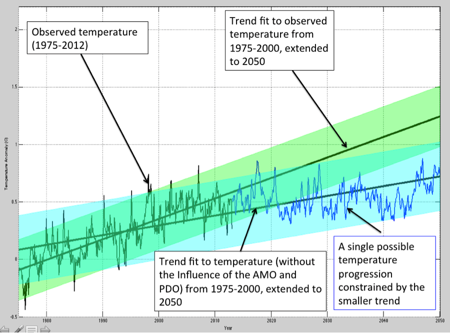 Fig. 6 illustrates an estimate of the path of the man (thick blue line) and the path of the dog (black line).  If we assume that the AMO and PDO can influence global temperature then we see that they account for most of the decade-to-decade variability in the rate of warming over the past 112 years. Times when the observed temperature was moving up faster than the externally forced temperature change (1900s to 1940s and 1970s to 2000s) were times when unforced internal variability was amplifying warming (the dog was on a steeper trajectory upwards than the man). On the other hand, times when the observed temperature was moving up slower than the externally forced temperature (1940s to 1970s) were times when unforced variability reduced the rate of global warming (the dog was moving downwards while the man was moving upwards). Notice that under this interpretation the rate of human-induced global warming over the past few decades has been cut approximately in half (similar conclusions have been reached by DelSole et al., 2011, Wu et al., 2011 and Toung and Zhou, 2013 among others). This is in contrast to the short leash view of Fig. 4 in which virtually 100% of warming over the past few decades has been due to external radiative forcings from human activities.