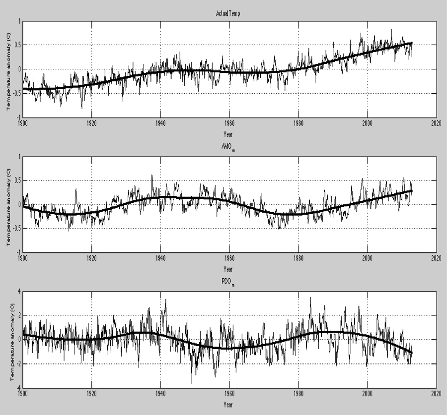 Fig. 5 shows the global mean monthly surface temperature from 1900 to 2011 along with the AMO index and PDO index. The AMO, in particular, seems to mimic the decade-to-decade variability in the surface temperature.