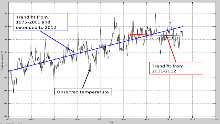 First, it’s important to note that it’s difficult to say if we are really experiencing a pause in global warming. It is true that if you fit a linear trend to the monthly global temperature progression from say, 2001-2012, you get a negative slope. However, if you fit a linear trend from 1975-2000 and then extend the trend through 2012 it is not obvious that recent temperatures have diverged significantly from the previous trend (Fig. 1). Nevertheless, the rate of warming has slowed in the 2000s relative to the 1990s. This article investigates why this might be the case.
