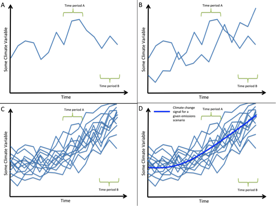 Imagine that we have climate model output for some climate variable (at a given location) over the next 100 years under a scenario of increasing greenhouse gas concentrations (Figure 2A). We notice that the variable increases and peaks during “Time period A” and then decreases until “Time period B”. We want to know if this pattern is part of the climate change signal (i.e., did the increase in greenhouse gasses cause this pattern?) or if it is just the result of random weather noise. The only way to find out is to run the climate model again (allowing it to simulate different random weather) and see if the same pattern shows up again.