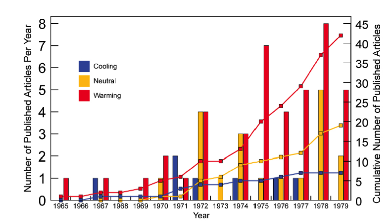 figure 1 – Number of scientific papers that predicted cooling, warming, or neutral temperature change by the year of publication.