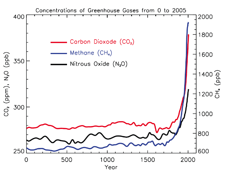 figure 2 – Concentrations of major greenhouse gasses over the last 2000 years