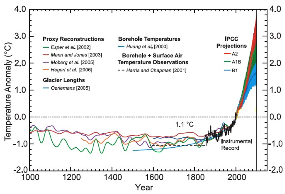 figure 1 – Projected global warming over the next century in the context of climate change over the past 1000 years. Future projections differ depending on estimated changes in human greenhouse gas emissions. (figure source: Chapman and Davis, 2010)