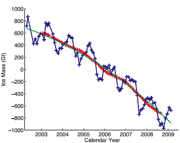 figure 3 – Satellite derived Ice mass in Greenland (left) and Antarctica (right) over the period 2002-2009.