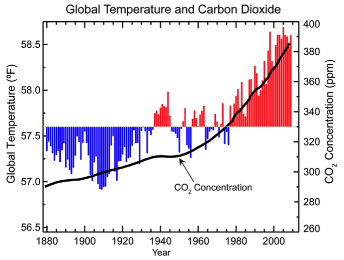 figure 1 – Global temperature and CO2 concentration from 1880-2009 (figure source:http://www.ncdc.noaa.gov/indicators/)